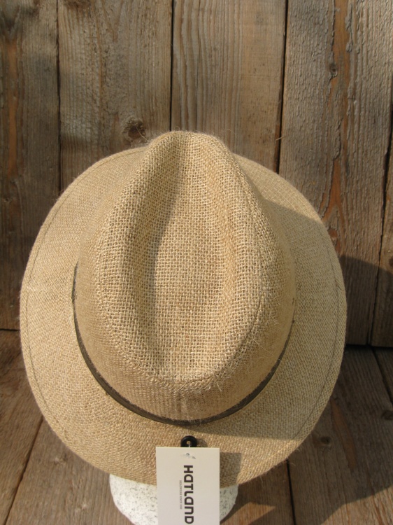 Deze beige hoed is gemaakt van organische hennep en heeft een bruine hoedenband met het logo van Hatland. De rand is 5 cm. breed en doorgestikt.