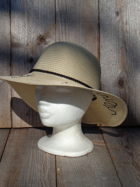 Deze hoed heeft op de rand in het zwart de tekst "enjoy summer".
