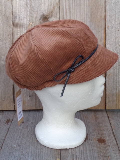 Deze corduroy pet heeft een sierstrikje op de rechterkant van de pet.