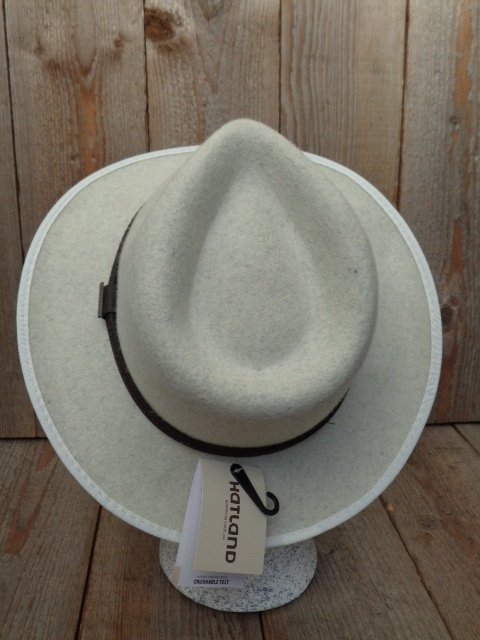 De hoed heeft een bruine hoedenband en het logo van Hatland staat aan de linkerkant.